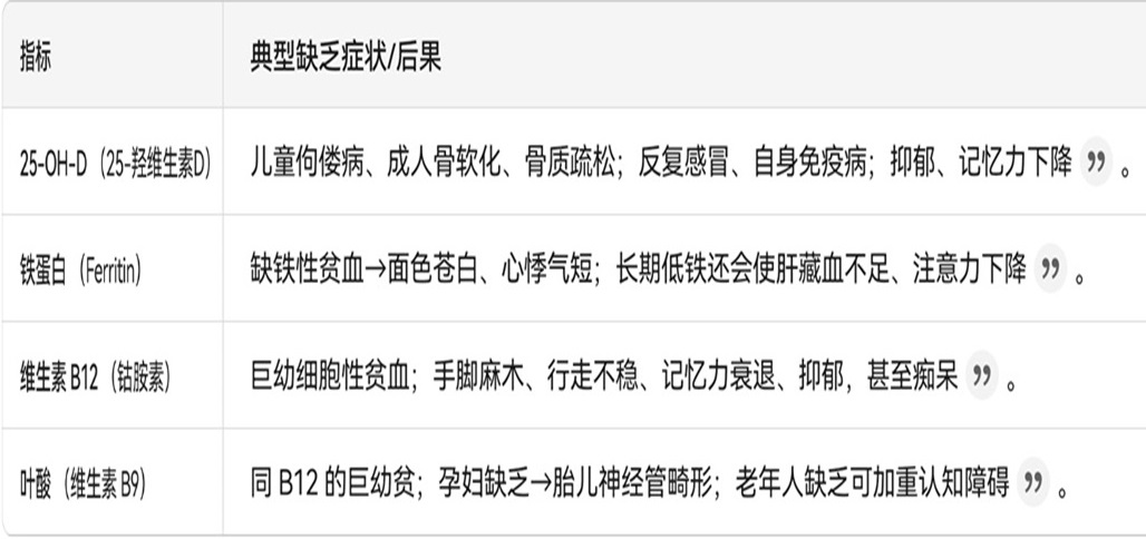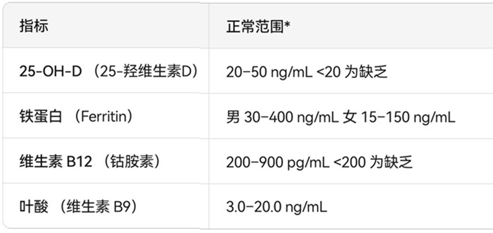 <2>.查 4 项基础血指标:25-OH-D、铁蛋白、维生素B12、叶酸,