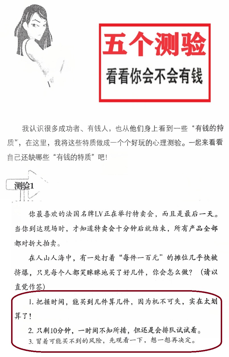 你最喜欢的法国名牌LV正在举行特卖会,而且是最后一天。当你到达现场时,才知道特卖会十分钟后就结束,所有产品全部都对折大拍卖。 在人山人海中,有一处打着“每件一百元”的摊位几乎快被挤爆,只见每个人都笑眯眯地买了好几件,你会怎么做?(请以直觉作答)