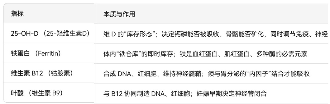 <2>.查 4 项基础血指标:25-OH-D、铁蛋白、维生素B12、叶酸,
